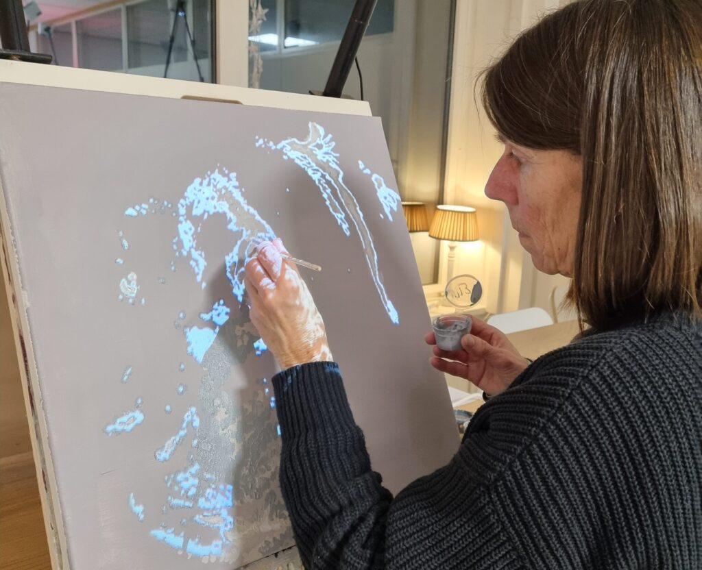 De projector projecteert per kleur het deel van het portret op het doek dat jij dan schildert. Vervolgens gaan we door naar de volgende iets donkerdere kleur. Zo schilder je in 6 stappen en dus met 6 kleuren een prachtig portret.